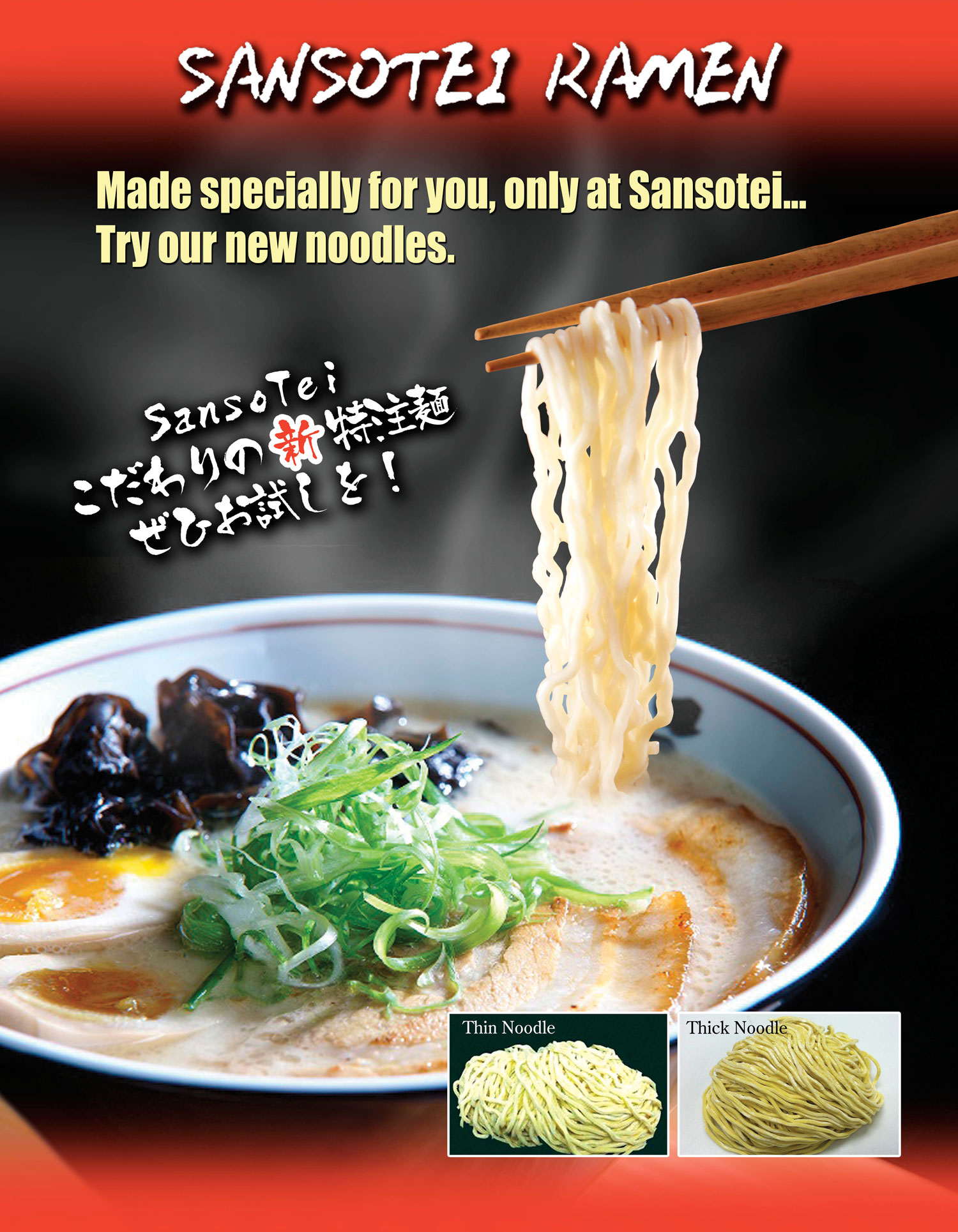 At Sansotei Ramen, our passion is to provide customers delicious and authentic ramen as well as friendly and cozy dining experience. We focus on a few popular Japanese ramen flavours and keep things simple. We use fresh pork bone delivered daily to make our signature broth – Tonkotsu. It takes hours to cook and we measure the concentration level hourly to ensure that the broth has reached the ideal thickness and texture. Please visit us soon and Happy Slurping.Most Popular